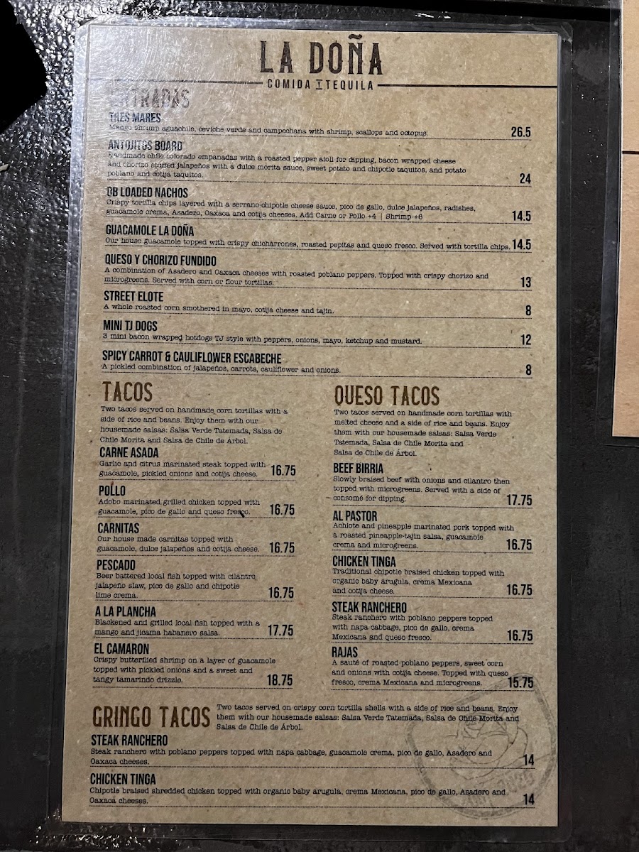 Customer experiences echo the quality and care La Doña puts into its food and service. From raving about the "incredible" flavors to appreciating the attentive staff—who are always eager to provide recommendations—it's clear that La Doña strives for excellence in every aspect. The gorgeous outdoor seating, covered and heated to keep patrons comfortable, allows for a truly enjoyable experience, day or night.